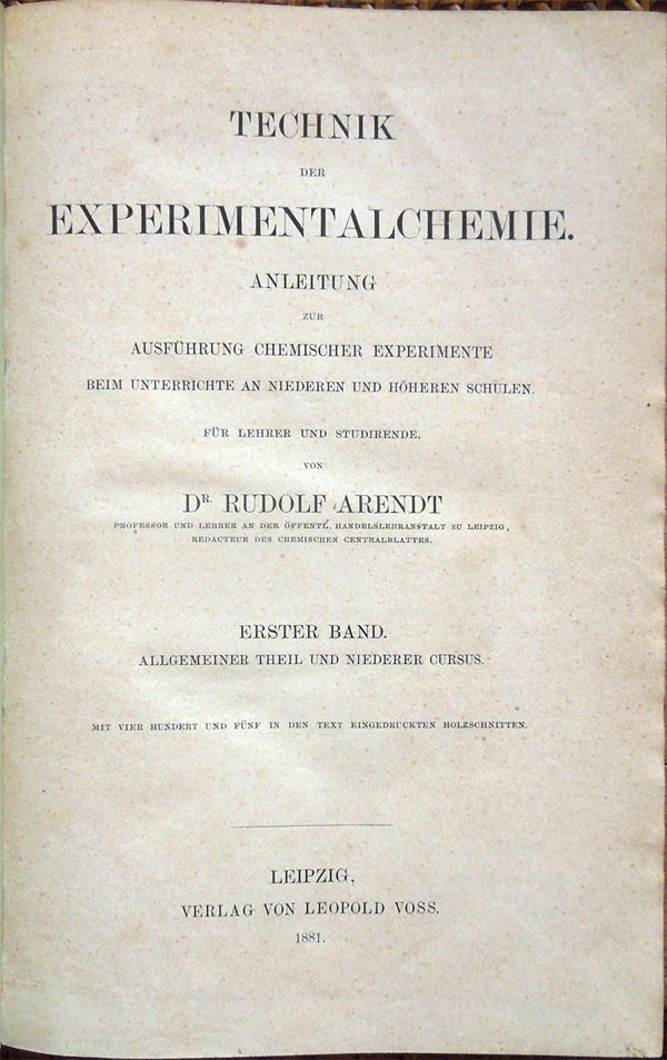 Technik der Experimentalchemie. Anleitung zur Ausführung chemischer Experimente beim Unterrichte an Niederen und Höheren Schulen für Lehrer und Studirende ... Erster Band. Allgemeiner Theil und Niederer Cursus [- Zweiter Band. Höherer Cursus] ...