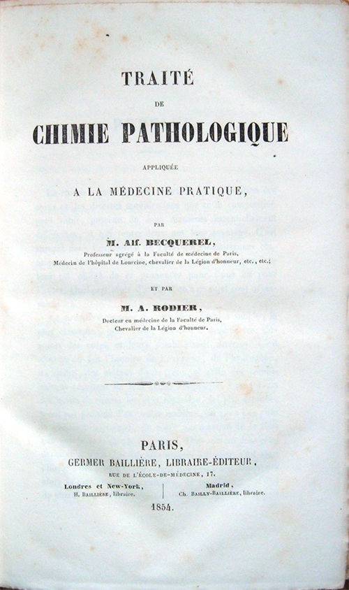 Traité de chimie pathologique appliquée à la médecine pratique. Par M. Alf. Becquerel, Professeur agrégé à la Faculté de médecine de Paris, Médecin de l'hôpital de Lourcine, chevalier de la Légion d'honneur, etc. etc et par M. A. Rodier