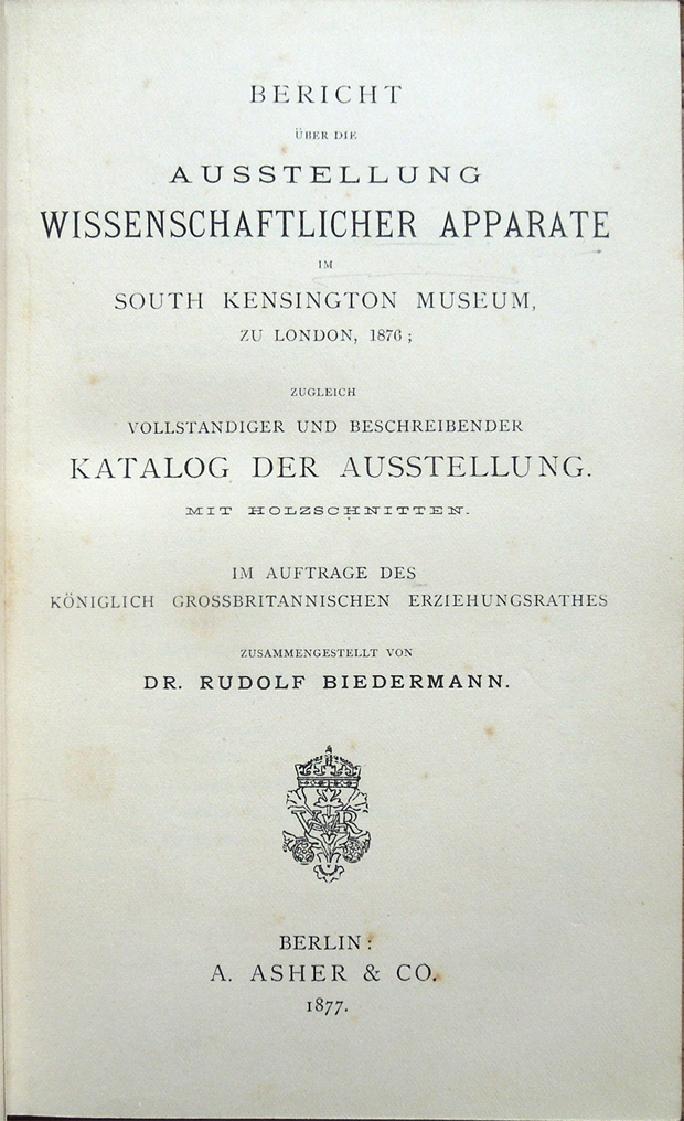 Bericht über die Ausstellung wissenschaftlicher Apparate im South Kensington Museum zu London, 1876; zugleich vollständiger und beschreibender Katalog der Ausstellung mit Holzschnitten ...
