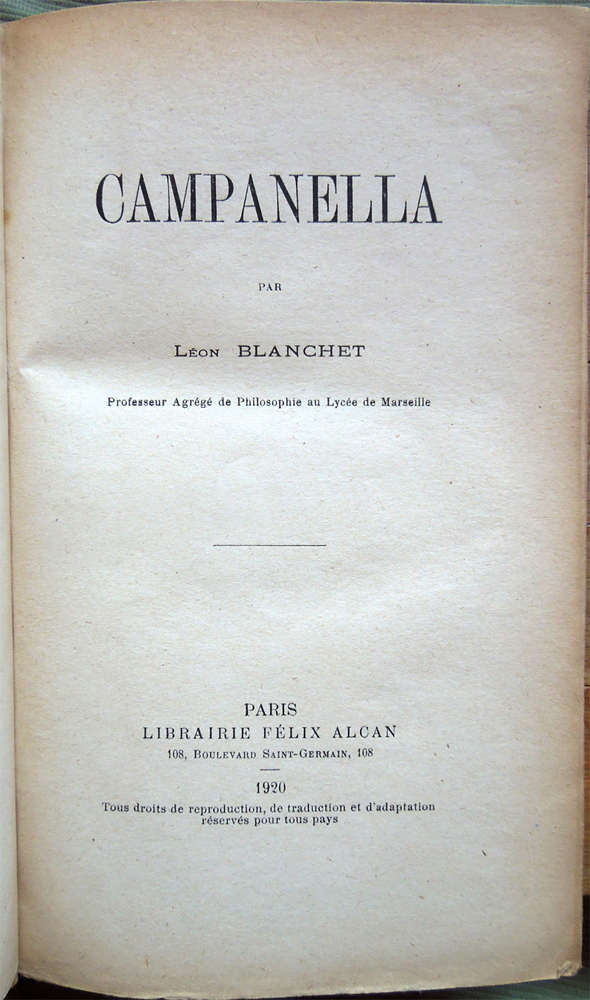 Campanella. Par Léon Blanchet, Professeur agrégé de Philosophie au Lycée de Marseille
