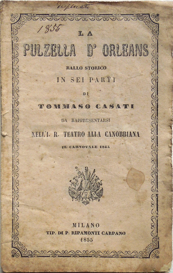 La pulzella d'Orleans. Ballo storico in sei parti di Tommaso Casati da rappresentarsi nell'I. R. Teatro alla Canobbiana il Carnovale 1855