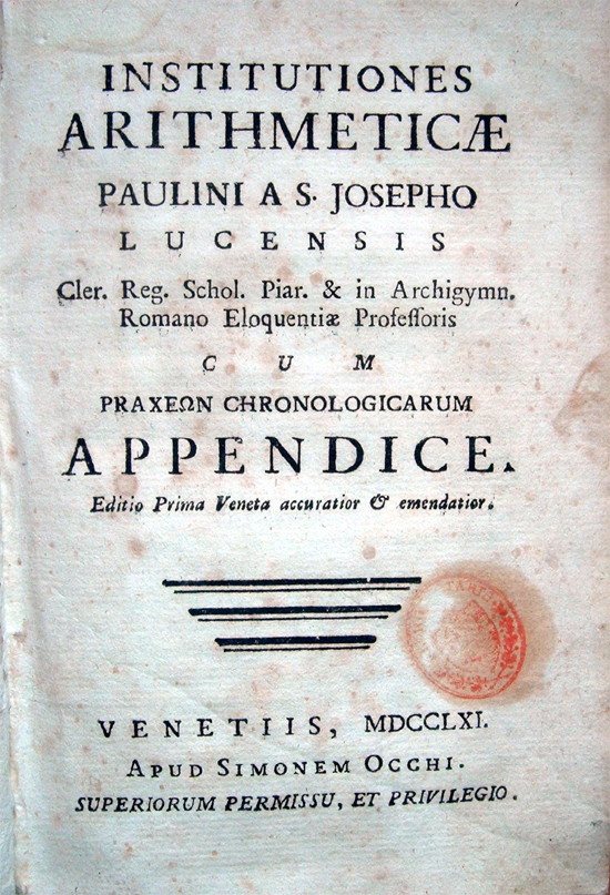 Institutiones arithmeticae Paulini a S. Josepho Lucensis Cler. Reg. Schol. Piar. & in Archigymn. Romano Eloquentiae Professoris, cum Praxeon chronologicarum appendice. Editio Prima Veneta accuratior et emendatior
