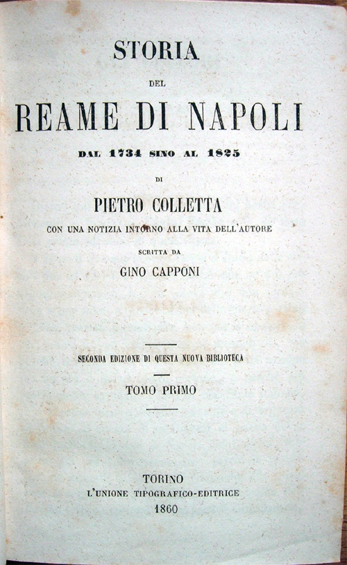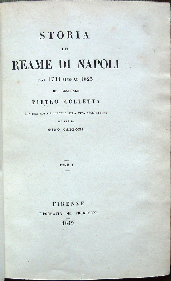 Storia del Reame di Napoli dal 1734 sino al 1825 del generale Pietro Colletta con una notizia intorno alla vita dell'autore scritta da Gino Capponi. Tomo I [-II]