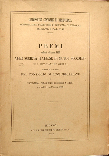Premi conferiti nell'anno 1866 alle Società Italiane di Mutuo Soccorso fra artigiani ed operai dietro relazione del Consiglio di aggiudicazione e programma pel quarto concorso a premi conferibili nell'anno 1867