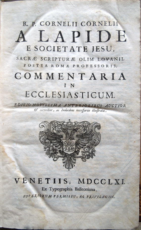 R. P. Cornelii Cornelii a Lapide e Societate Jesu, Sacrae Scripturae olim Lovanii, postea Romae Professoris, Commentaria in Ecclesiasticum. Editio novissima anterioribus auctior, et correctior, ac Indicibus necessariis illustrata