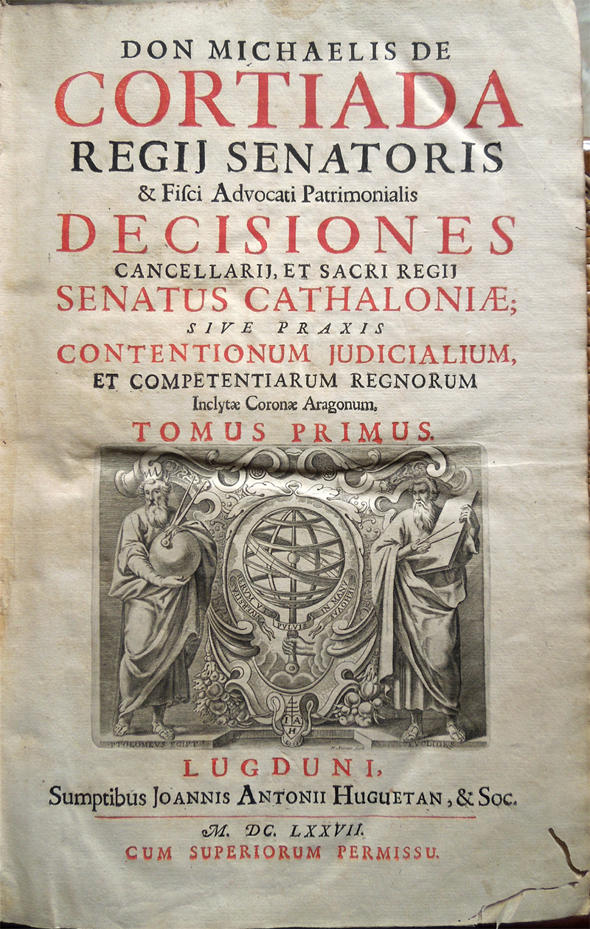 Don Michaelis De Cortiada regij senatoris et Fisci Advocati Patrimonialis Decisiones Cancellarij, et sacri regij Senatus Cathaloniae, sive praxis contentionum judicialium, et competentiarum regnorum inclytae Coronae Aragonum