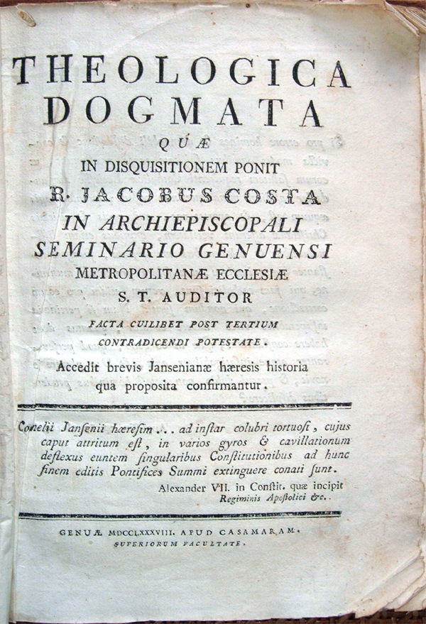 Theologica dogmata quae in disquisitionem ponit R. Jacobus Costa, in Archiepiscopali Seminario genuensi Metropolitanae ecclesiae S. T. auditor, facta cuilibet post tertium contradicendi potestate. Accedit brevis Jansenianae haeresis historia