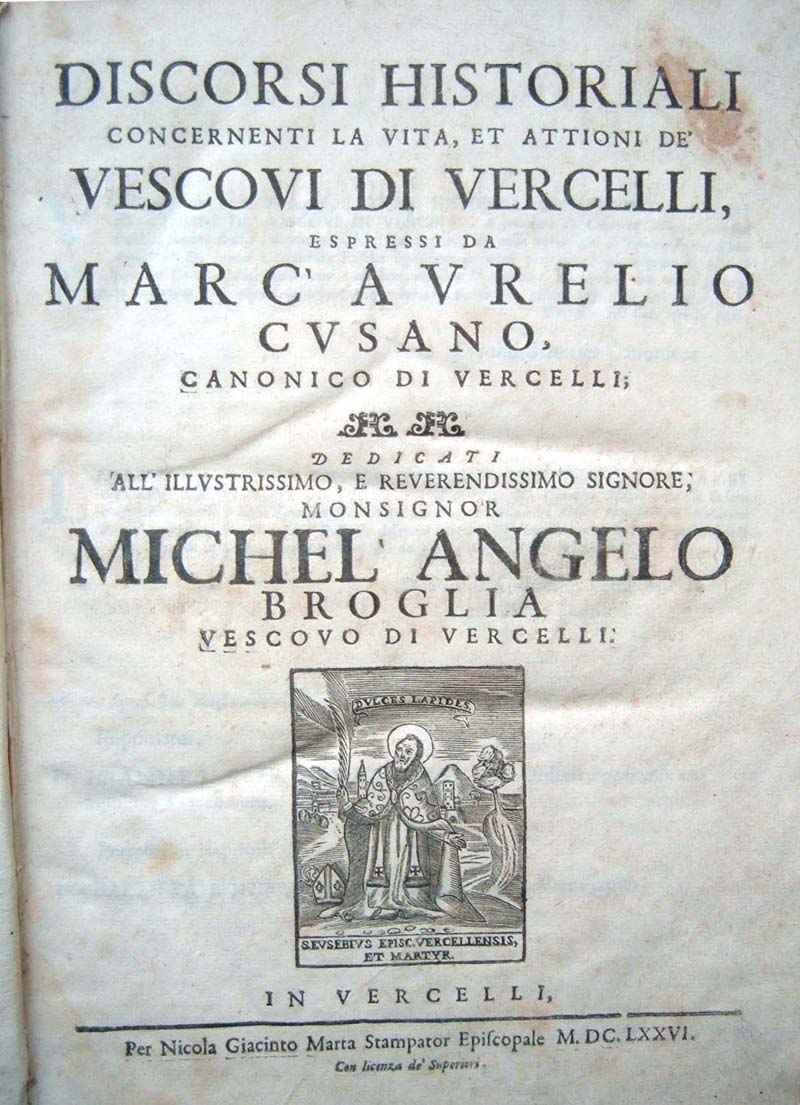 Discorsi historiali concernenti la vita, et attioni de' vescovi di Vercelli, espressi da Marc'Aurelio Cusano, canonico di Vercelli; dedicati all'Illustrissimo, e Reverendissimo Signore, Monsignor Michel'Angelo Broglia vescovo di Vercelli