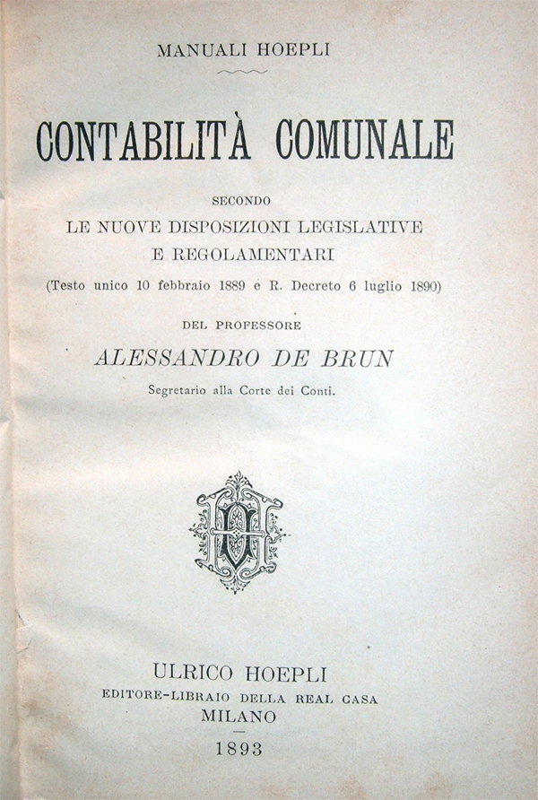 Contabilità comunale secondo le nuove disposizioni legislative e regolamentari (Testo unico 10 febbraio 1889 e R. Decreto 6 luglio 1890) del Professore Alessandro De Brun, Segretario alla Corte dei Conti