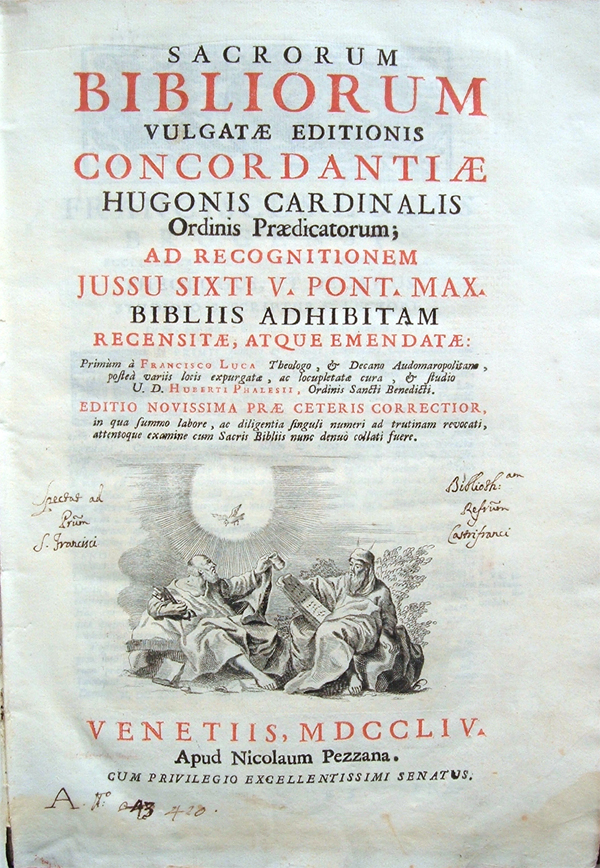 Sacrorum Bibliorum vulgatae editionis concordantiae Hugonis Cardinalis Ordinis Praedicatorum, ad recognitionem jussu Sixti V Pont. Max. bibliis adhibitam recensitae, atque emendatae