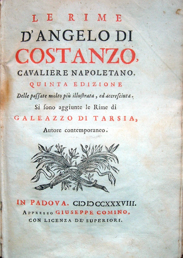 Le rime d'Angelo di Costanzo Cavaliere Napoletano. Quinta edizione, delle passate molto più illustrata, ed accresciuta. Si sono aggiunte le Rime di Galeazzo di Tarsia, autore contemporaneo