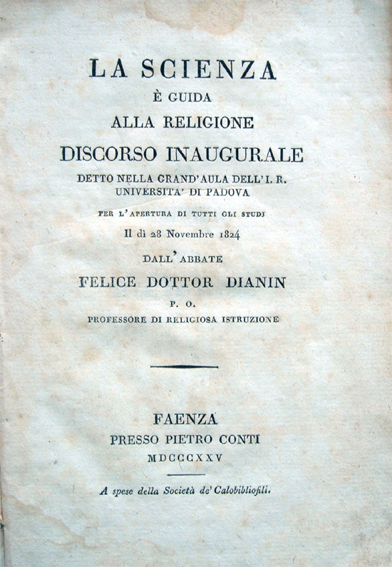 La scienza è guida alla religione. Discorso inaugurale detto nella grand'aula dell'I. R. Università di Padova per l'apertura di tutti gli studi il dì 28 Novembre 1824 dall'abate Felice Dottor Dianin P. O., Professore di Religiosa istruzione