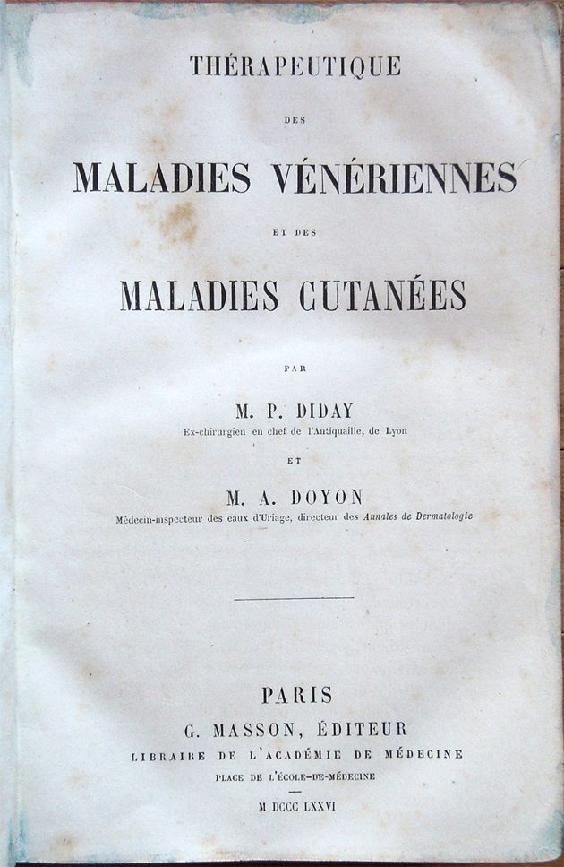 Thérapeutique des maladies vénériennes et des maladies cutanées, par M. P. Diday ex-chirurgien en chef de l'Antiquaille, de Lyon, et M. A. Doyon Médecin-inspecteur des eaux d'Uriage, directeur des Annales de Dermatologie