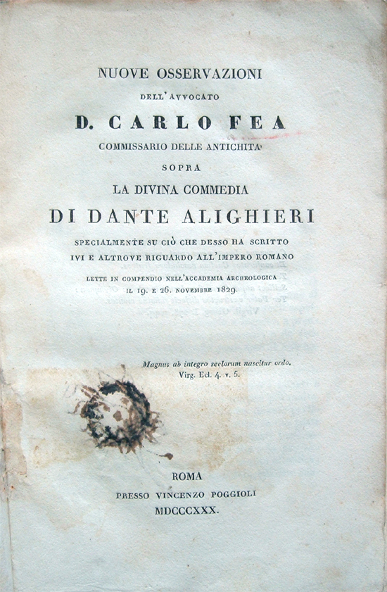 Nuove osservazioni dell'avvocato D. Carlo Fea Commissario delle Antichità sopra la Divina Commedia di Dante Alighieri, specialmente su ciò che desso ha scritto ivi e altrove riguardo all'impero romano, lette in compendio nell'Accademia Archeologica