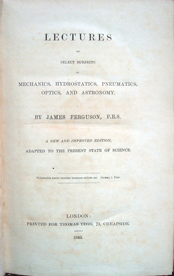Lectures on select subjects in Mechanics, Hydrostatics, Pneumatics, Optics, and Astronomy. By James Ferguson, F. R. S. A new and improved Edition, adapted to the present state of Science