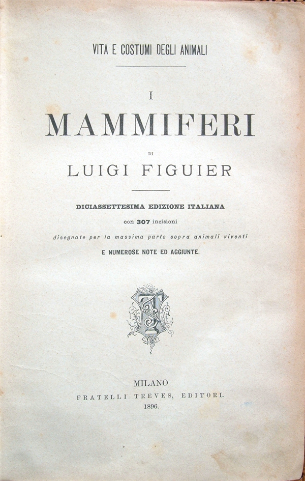 Vita e costumi degli animali. I Mammiferi, di Luigi Figuier. Diciassettesima edizione italiana con 307 incisioni disegnate per la massima parte sopra animali viventi e numerose note ed aggiunte