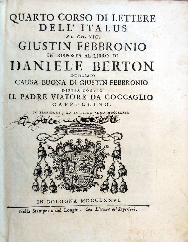 Quarto corso di lettere dell'Italus al Ch. Sig. Giustin Febbronio in risposta al libro di Daniele Berton intitolato Causa buona di Giustin Febbronio difesa contro il Padre Viatore da Coccaglio cappuccino. In Francfort, ed in Lipsia anno MDCCLXXII